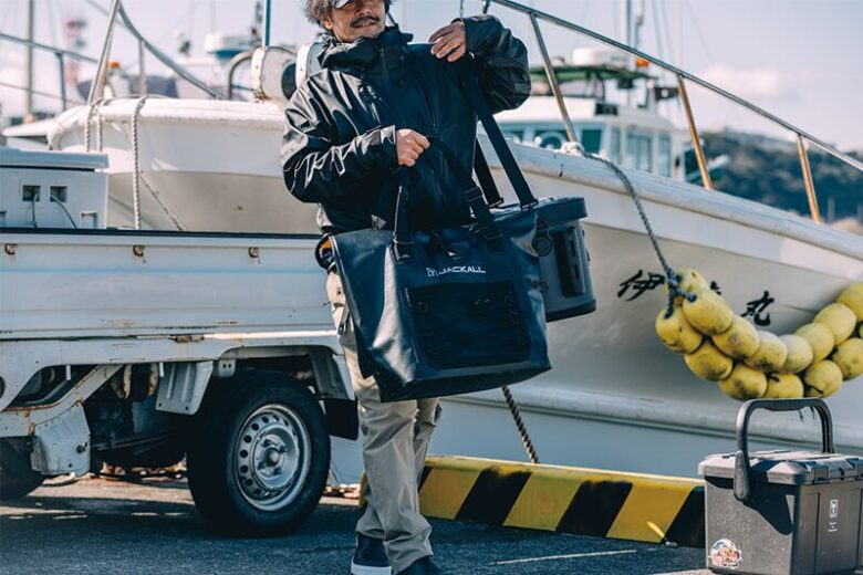 電車釣行や遠征、オフショアフィッシングなどあらゆるシーンで活躍する耐久性の高い防水トートバック。