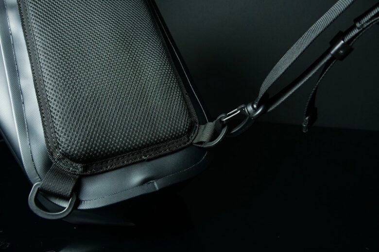 本体にはウェルダー加工を施し、止水ファスナーを使用。防水性を兼ね備えたショルダーバッグ。