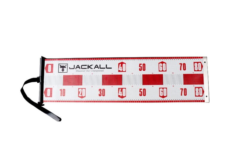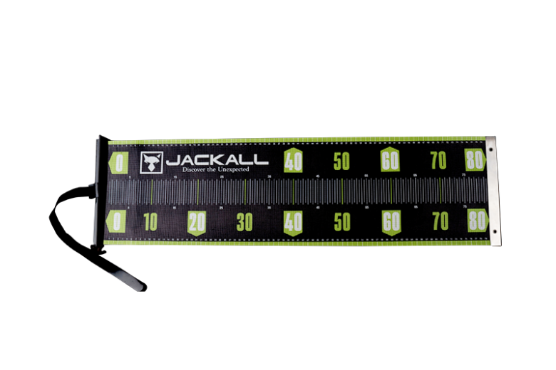 目盛り部分には視認性の高い大型フォントを採用。ジャッカルのロゴ&グラフィックをあしらったデザインは、釣果写真も映える一枚です。