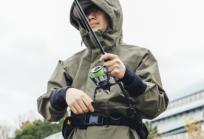 軽量ストレッチ生地がキャストやロッド操作の動きを妨げず、雨天時でも快適な釣りをサポートします。