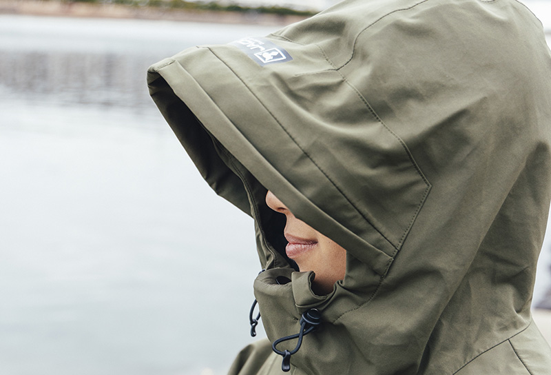 フードは大型ツバ付きで、視界を確保しながらも雨垂れや風の吹き込みを軽減。