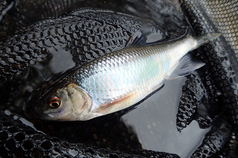 自然界にいる魚を観察してみると、その色合いは非常に複雑な構成をしています。例えばワカサギの背から側面にかけての紫やオイカワの婚姻色などは単色で構成されているのではなく、いくつもの色が重なりあい、さらに角度によって発色が変わって見えます。