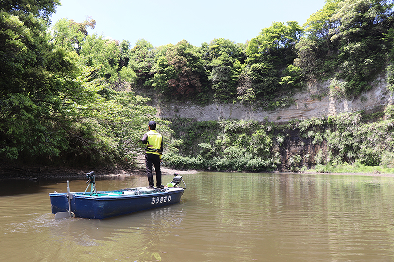まるでボートで大きく移動しているかの様な速さでエレクトリックモーターで流してサーチする。短時間で広範囲をカバーできるので、バスを見つける確率の向上とインプットされる情報量が多い。
