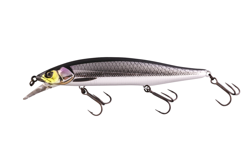 大型河川でバスフィッシングをすることが多い加木屋プロのリクエストは、バスが良く捕食しているイナ(ボラの子供)をイミテートしたシルバー系のカラーでした。いわゆる古典的な銀黒系カラーですが、RVミノー110SPのアクションを活かすべく、側面のシルバーの部分は上下でペイントベースとホロフィルムベースを分けることで明滅効果に変化をつける工夫が施されています。