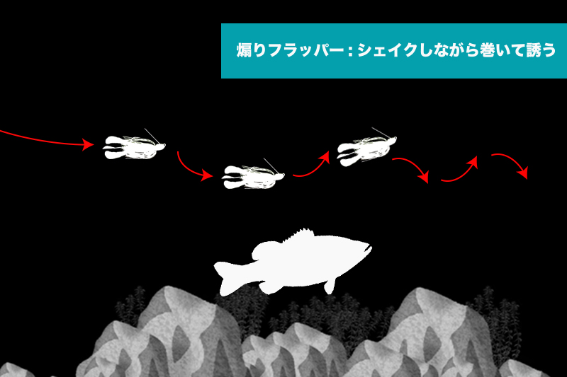 最近ではその状況下ではソフトベイトをノーシンカーで使用し、着水地点から奥に入り込んでいくバックスライドが多用されていますが、スローなアプローチになれてしまっているバスを攻略するためにビークロールスイマー&フラッパーの「煽りスイム」が効果的です。