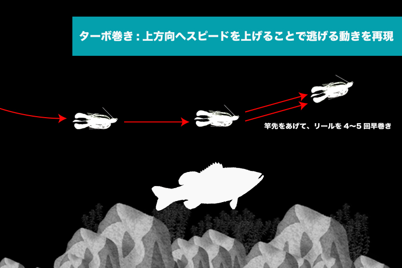 これも喰わせどころのない、遠浅のシャローで追尾してくるがバイトしなかったり、バスとのディスタンスに十分な距離が無くなってしまった場合などにロッドティップを数十センチ上げると同時にリールのハンドルを4~5回早巻きします。これは、一定レンジ・速度のスイムジグの軌道を急激に上方向に変化させてバイトのきっかけをアングラーから仕掛ける釣り方です。