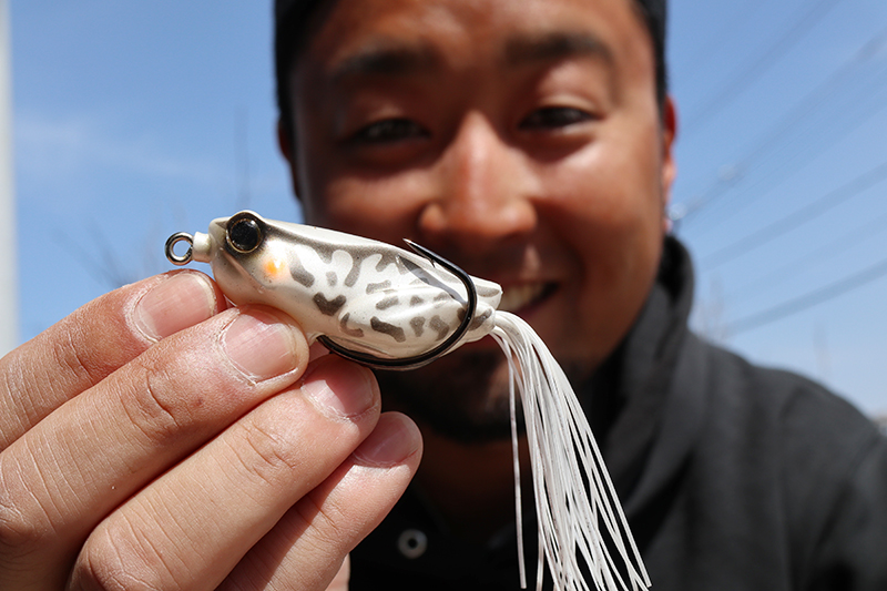 護岸沿いなどで追われて水面付近を逃げるエビを捕食する、いわゆるエビボイルパターンはトップウォーターでの攻略がおすすめ。今年も超コンパクトフロッグのスピンガヴァチョが活躍してます。