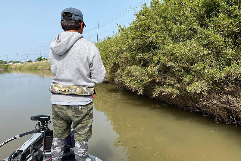 具体的には、アシのポケットの最奥のゴミ下や倒れたアシが集まった所や岸から倒れこんだレイダウンの枝、消波ブロックの最奥の穴といった極々狭いスポットです。