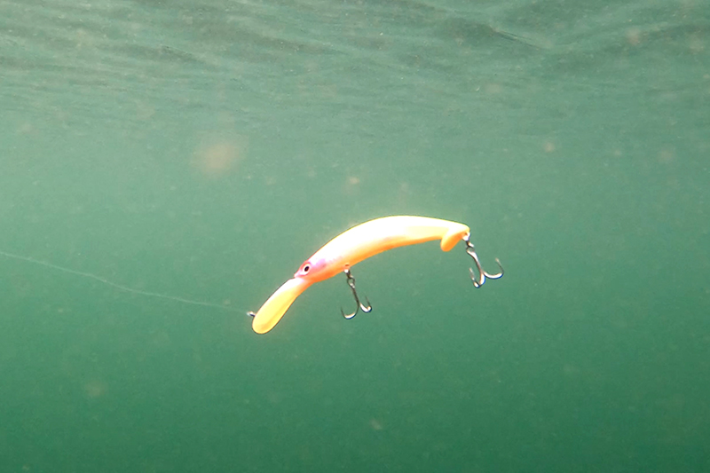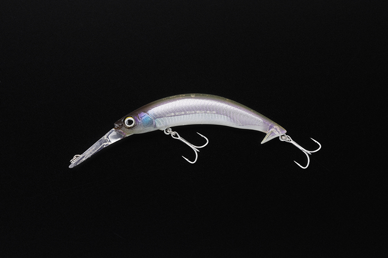 ロングビル(長いリップ)ながらも、潜航深度は約30cmとかなり浅いレンジを想定した設計です。かなり先端に設定されたアイ位置と合わせて、大きなアクションを生むために特化させたものなのです。
