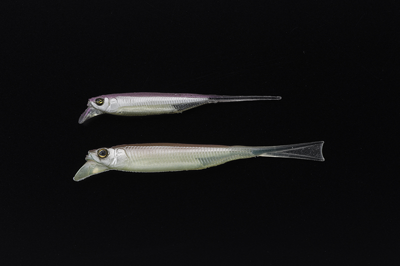 オリジナルの3インチがスッと伸びたピンテール形状であるのに対し、4インチは縦方向の上下に分かれたピンテールの間に薄い膜が貼られた尾ビレのような形状になっています。