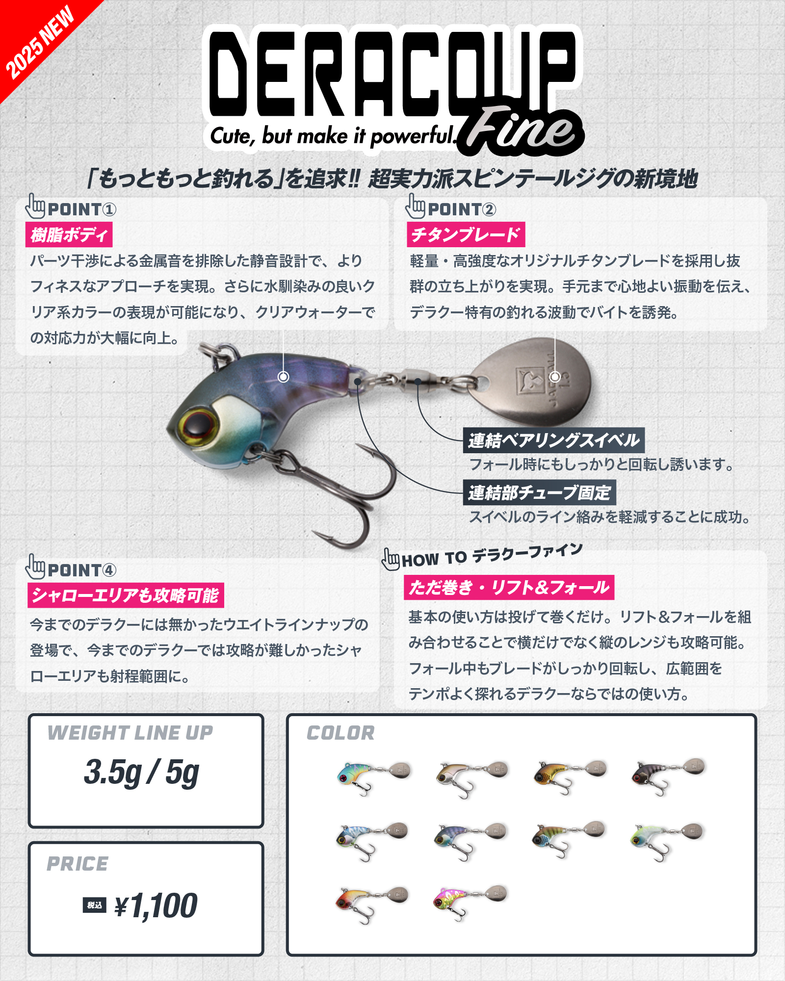 今回はボディシェイプと性能の違いに注目。5gは低重心設計で安定したスイム姿勢を実現し、3.5gは専用設計で軽快な巻き感と高バランスを両立。5gは「重厚な掴み感」、3.5gは「軽やかな操作感」が特徴。実釣でも3.5gが好反応を見せ、複数ヒットを記録。進化したフィネス性能をぜひご体感ください。