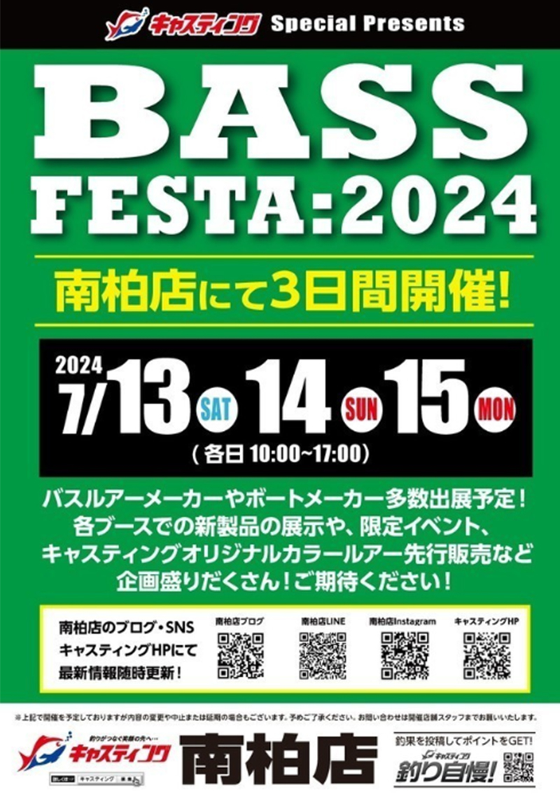 2024年7月13日(土) 14日(日) 15日(月)に釣具のキャスティング 南柏店様で「BASS FESTA:2024」が開催されます。