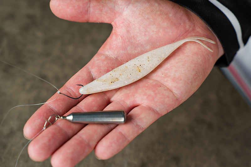 例年のような“秋感”があまりなく、まだ夏っぽい湖の状況に良かったのが、シャッドシェイプなワームに2ozのシンカーをセットしたダウンショットリグでした。