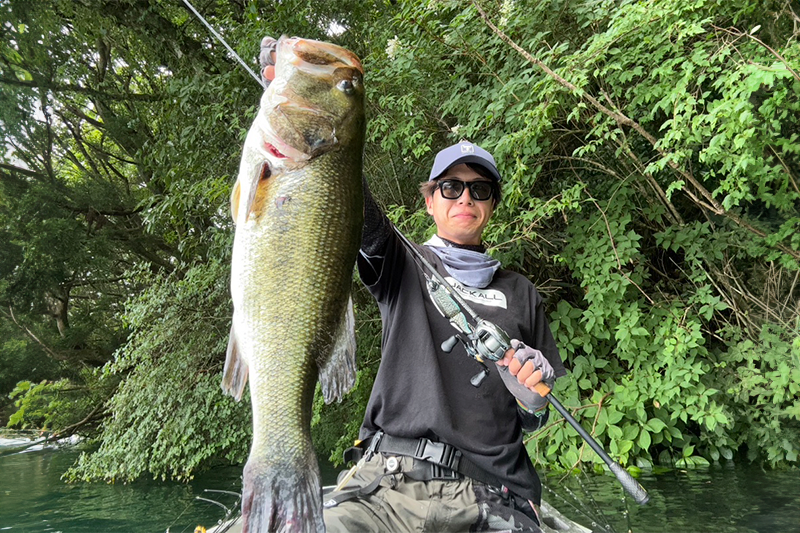 デカバスのチェイスは相当数ありましたが、なかなか口を使ってくれなかったため、ジャークを織り交ぜながら更にスピーディーなアクションで攻めると、突然の突き上げバイトが発生しました。重たいロクマルの引きに対しても、ロッド全体が綺麗に曲がり、魚が浮いてきてくれて無事にキャッチすることができました。