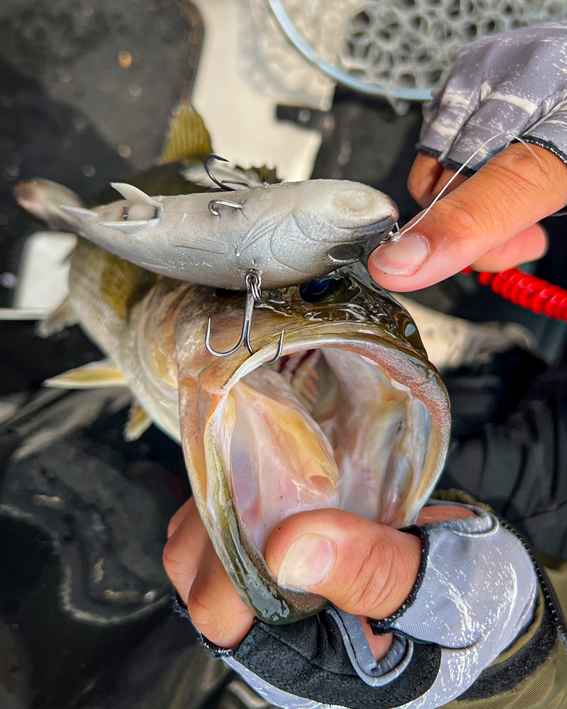 これは吸い込んでバイトするバスに対して非常に効果的で、エラ洗いしたりジャンプしたりとフックアウトさせるのが上手なバスには、口周りで掛けてファイトした方がバレにくいのです。