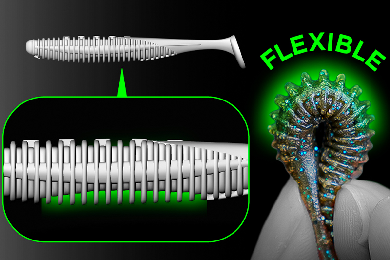 ボディ全体がリブ形状になっており、全体で水をまとい、更にお腹の部分は深いリブになっておりフッキングの際にワームが折れ曲がりやすくフックアップ率が高くなっています。