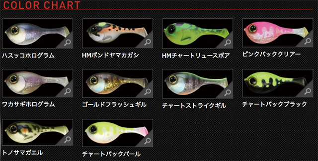 横から見ればブルーギル、上や下から見たらカエルやオタマジャクシ、ネズミ…などといったフィールドに身近に存在するバスのベイトとなりうる様々な生き物たちに化けれるシルエットを生かして、ベイトフィッシュ系(ハスッコホログラム、ワカサギホログラム、チャートストライクギル、ゴールドフラッシュギル)はもちろん、カエル(トノサマガエル)、ヘビ(HMポンドヤマカガシ、HMチャートリュースボア)などのカラーを作りました。