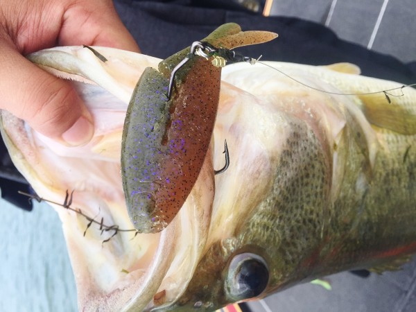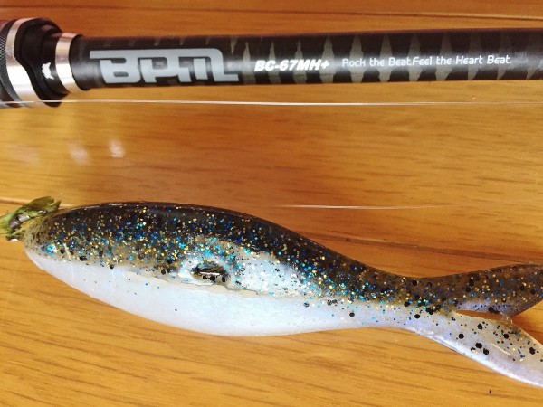 そのタイミングに合わせてポイントに入り直し(当日はオオカナダモが生えているエリア)、アクションは2トゥイッチからの3秒フォール。