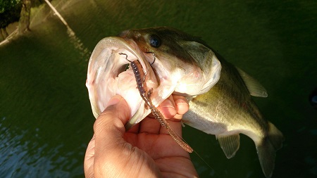 そして日中はカバーや立ち木群でパインシュリンプ4.5″のテキサスリグを