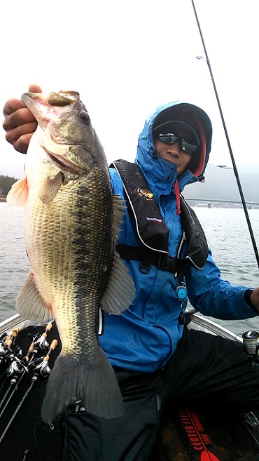 フィッシングショー前に、吹雪の中で3時間ほど河口湖へ出てライトリグでゲットした52センチ。