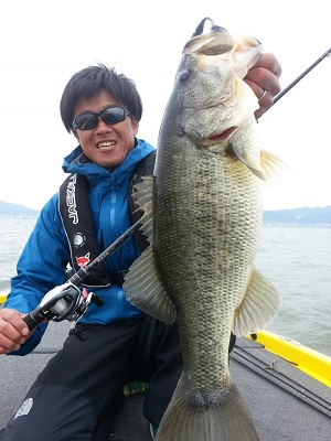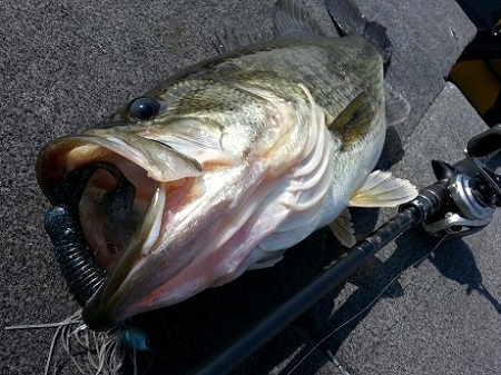 上がって来たのはルアーを丸呑みにしたプリスポーンのデカバスでした。