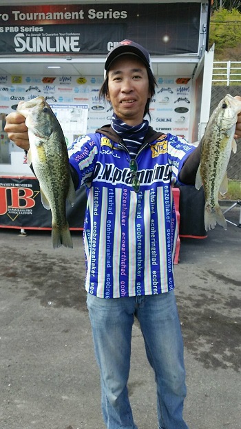 ライトキャロライナリグで差しくるバスを狙い、初日は3匹974g。