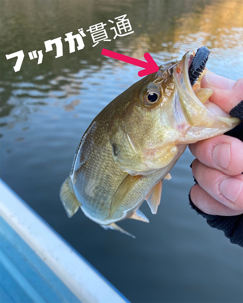 冬場のバスはやはり低活性ということもあり、バイトしてもいわゆる皮一枚という唇の縁ギリギリにかろうじてフッキングしていることも珍しくないのですが、このサイスフィネスはもう一段奥に、しかもしっかりと貫通してフッキングしていることがほとんどです。