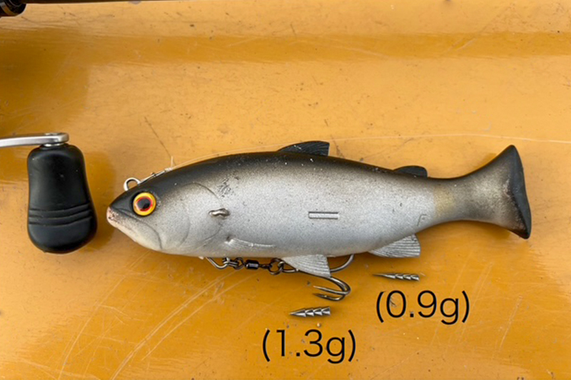 スローシンキング(デッドスローアクション)にするには腹部に1.3g尻ビレに0.9gのネイルシンカーを入れる必要があります。