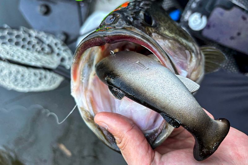 これら大型のベイトフィッシュを捕食しているフィールドでは、頭から飲み込んだにもかかわらず喉につっかえて身動きがとれなくなり、浮いているバスを救助するという状況にたまに遭遇します。