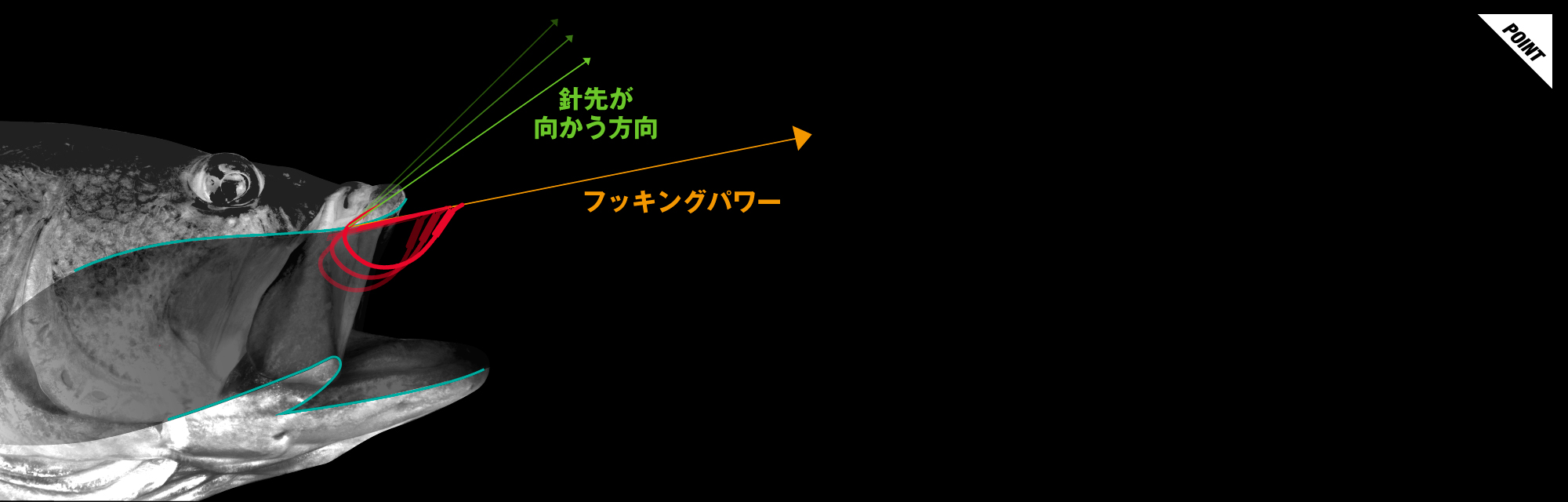 アップアイの採用によりフックポイントが表皮に接触し易く、貫通性が維持できる範囲で大きく設計しています。