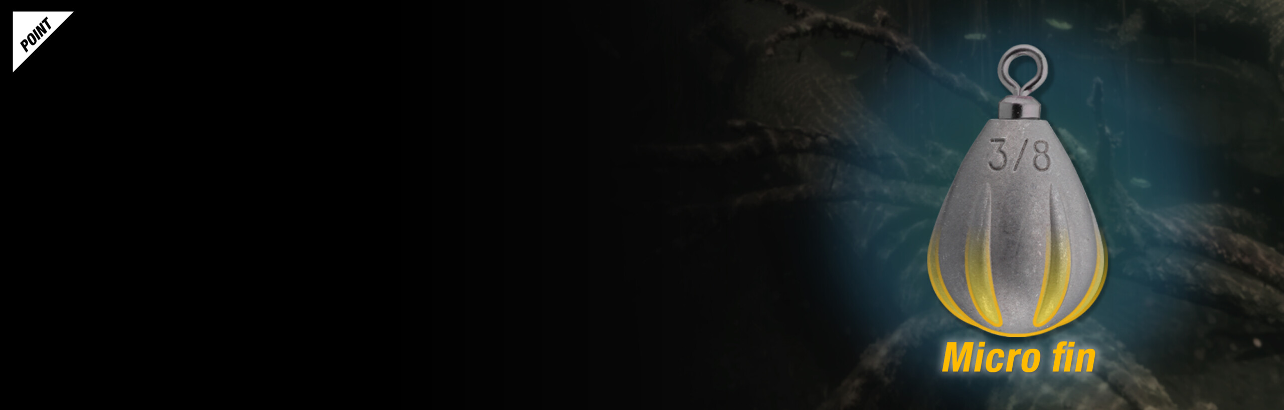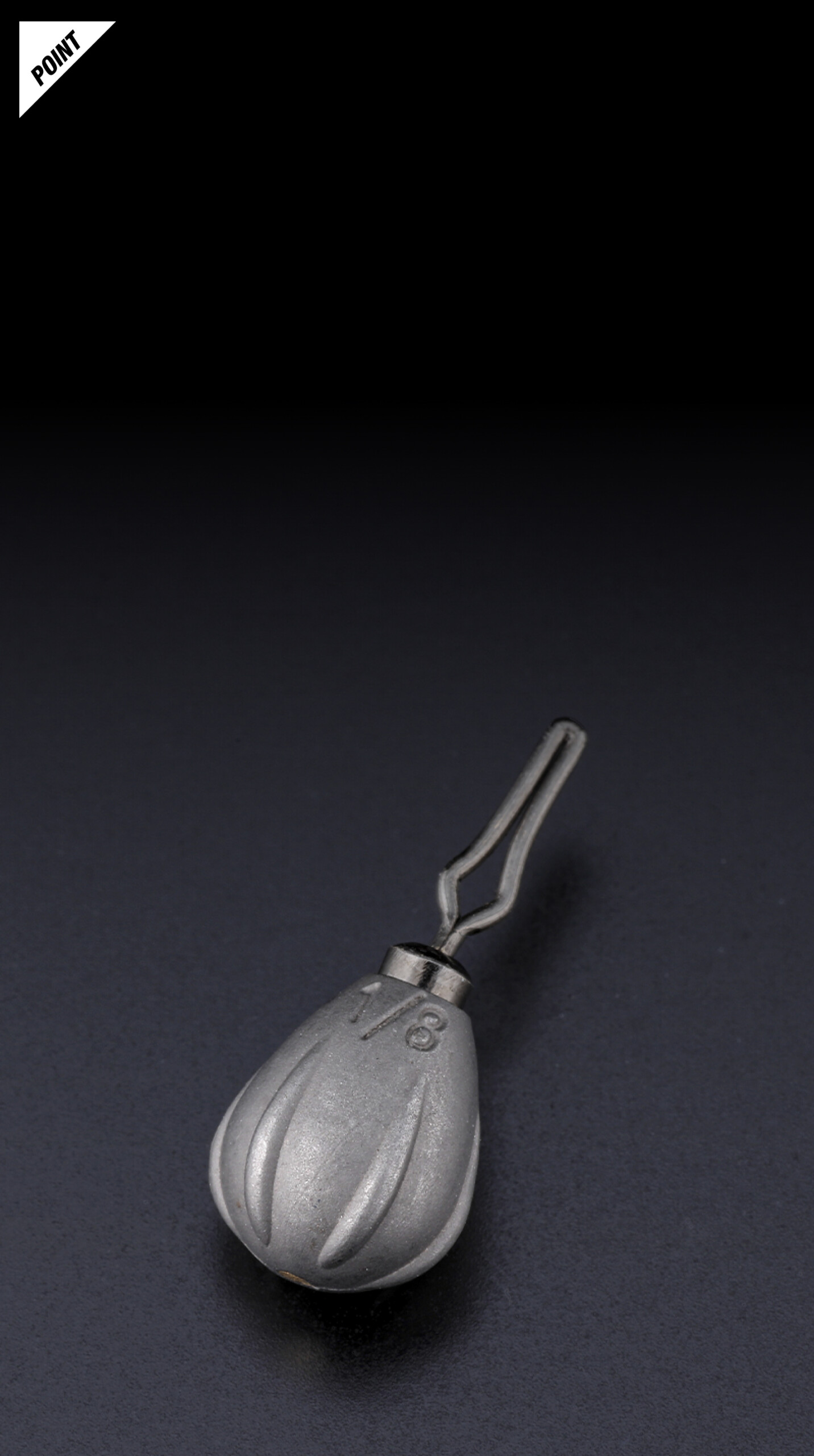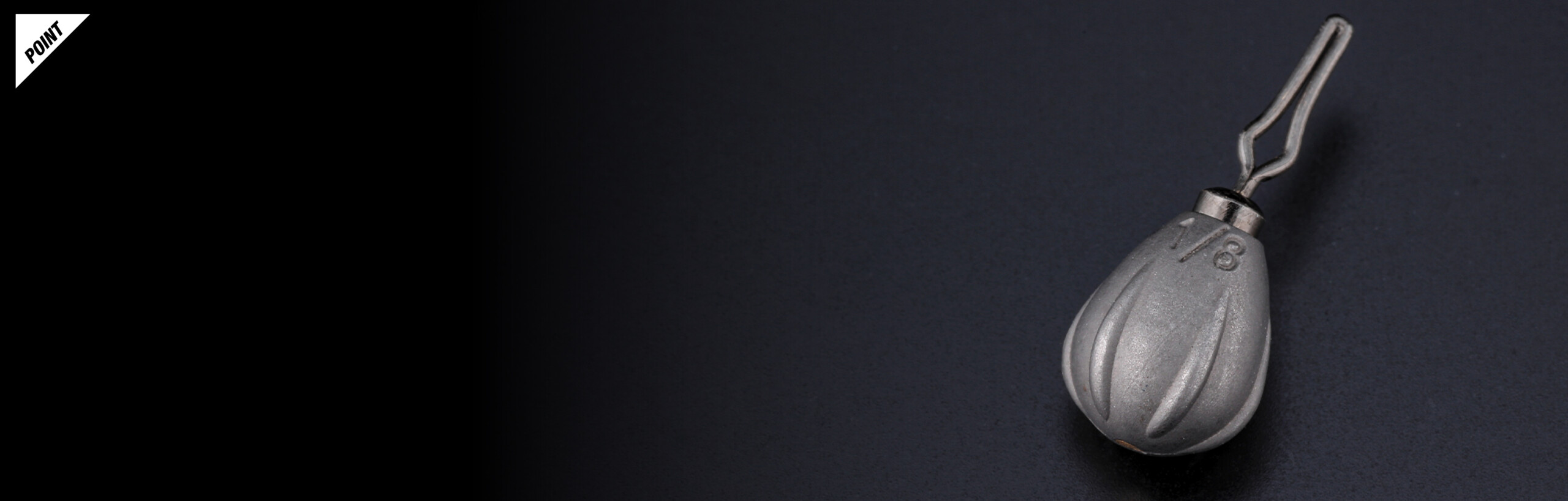 ティアドロップ形状(涙型)にマイクロフィンを搭載する事で、シンカーが意図せず転がらないため一点での誘いに効果的です。また、ボトムやストラクチャーに対して適度なスタック感(引っ掛かり感)を発生させ、リグの状態をアングラーが把握し易くなります。