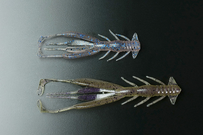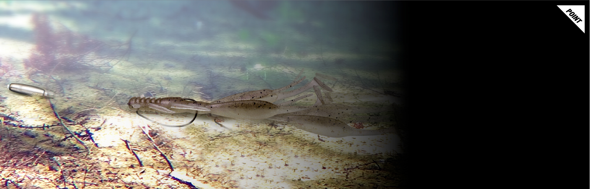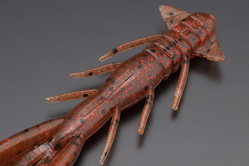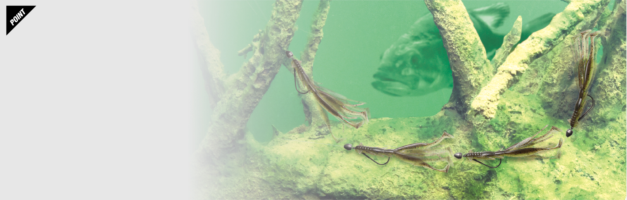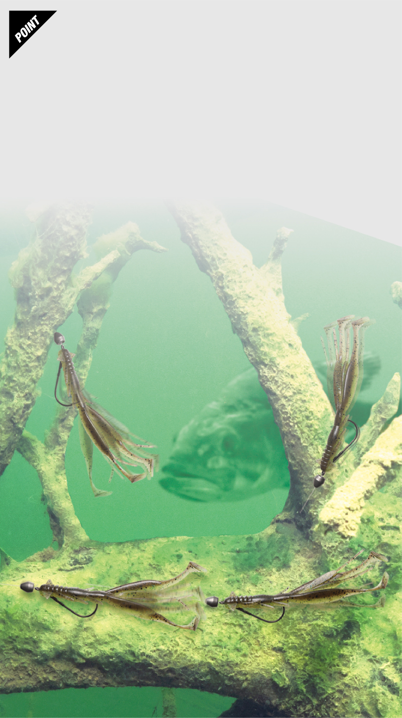 カバーに吊るして誘う時などの微細なアクションの入力にも高レスポンスで反応。ボトム着底時には薄いフラットテール部が水圧を受け、時間差で艶めかしく倒れ込みます。