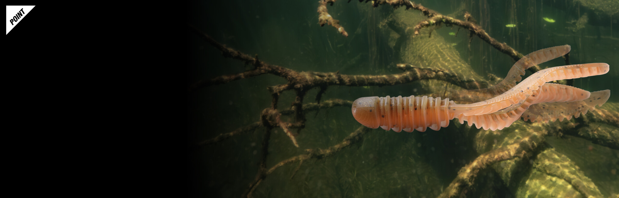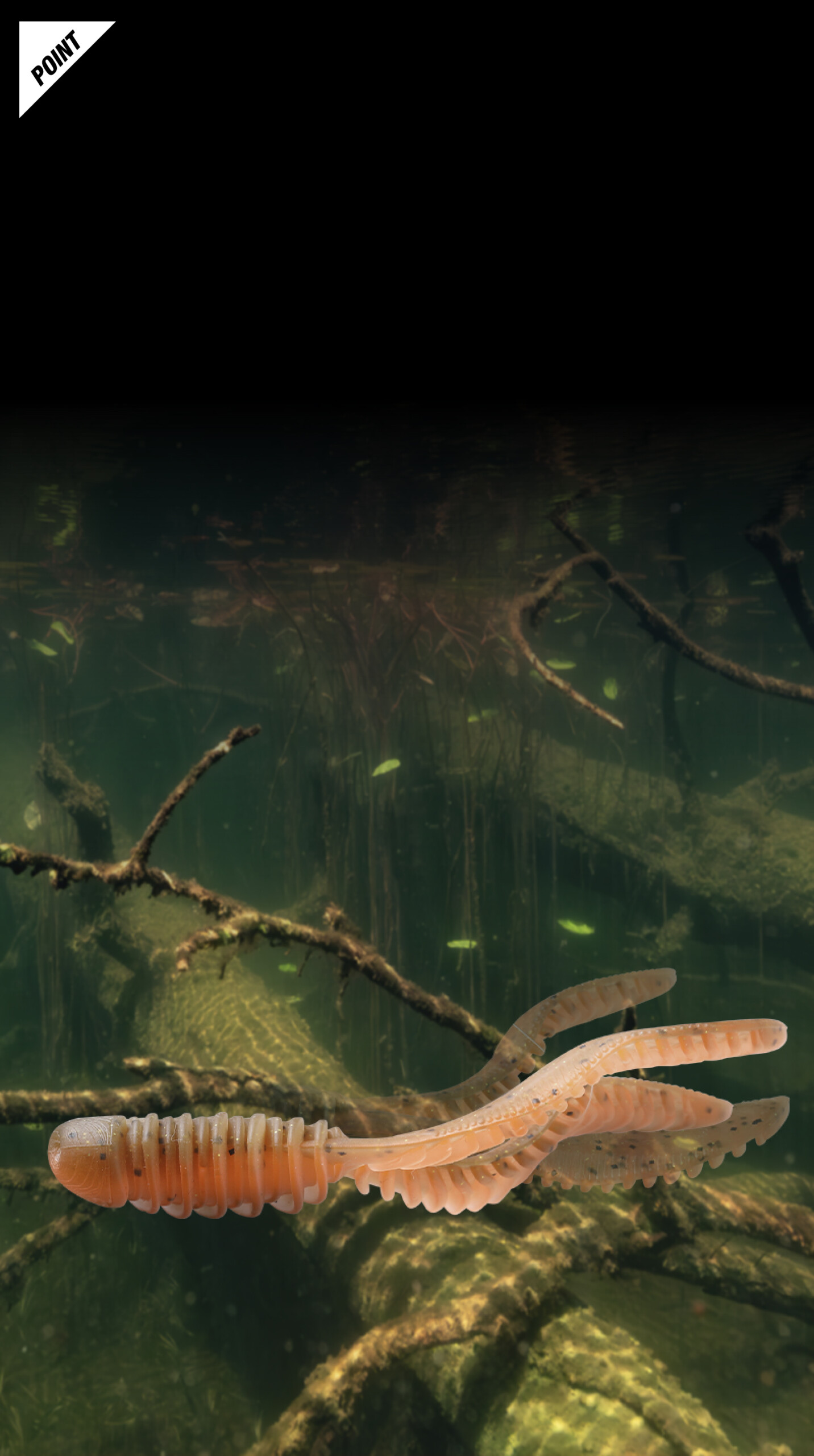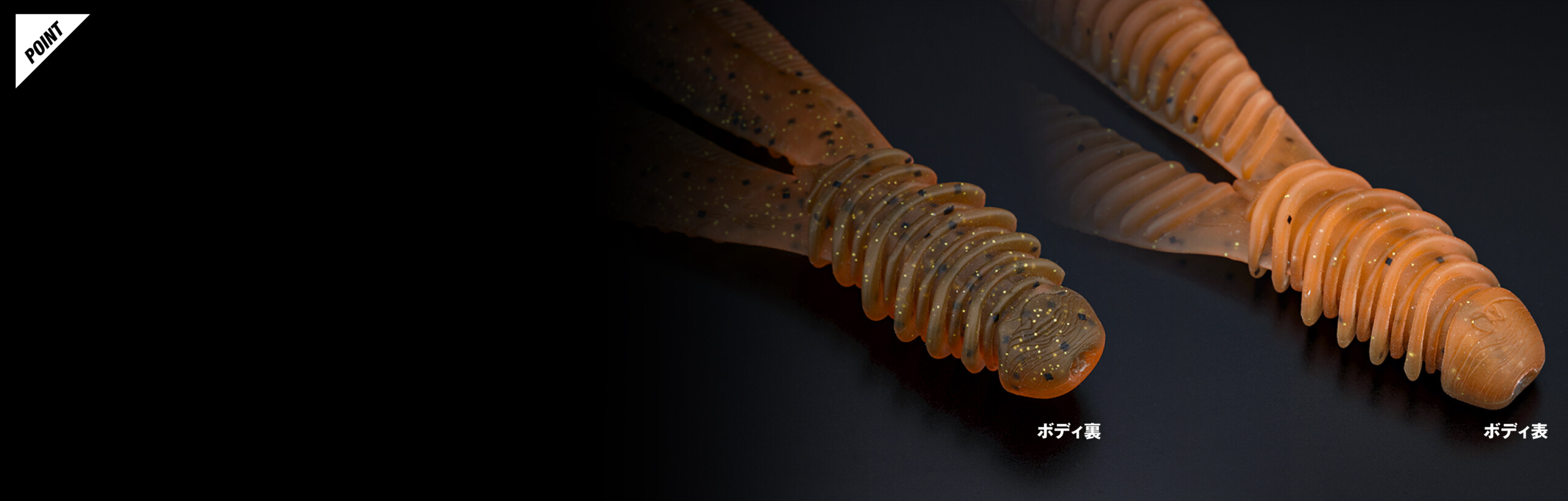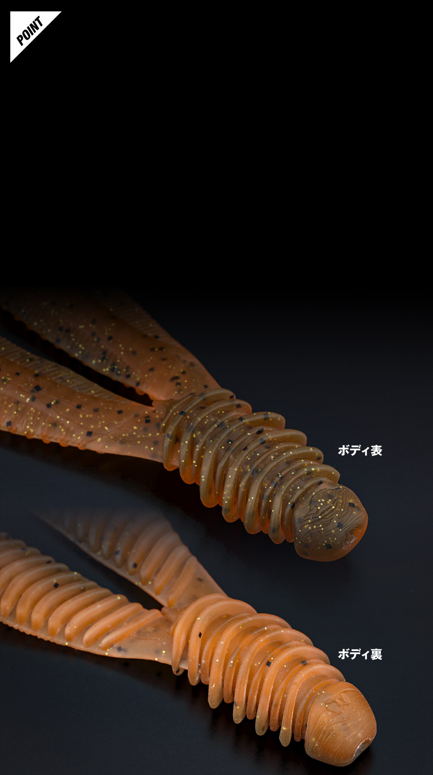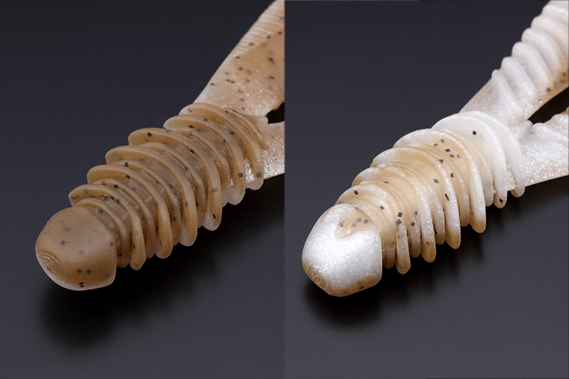 エラストマー素材の持つ耐久性の恩恵で、限界までソフトなマテリアルを採用可能となりました。アクションを加えた際は艶めかしく誘い、ボトムで置いておくだけでも僅かな水流で揺らめきます。