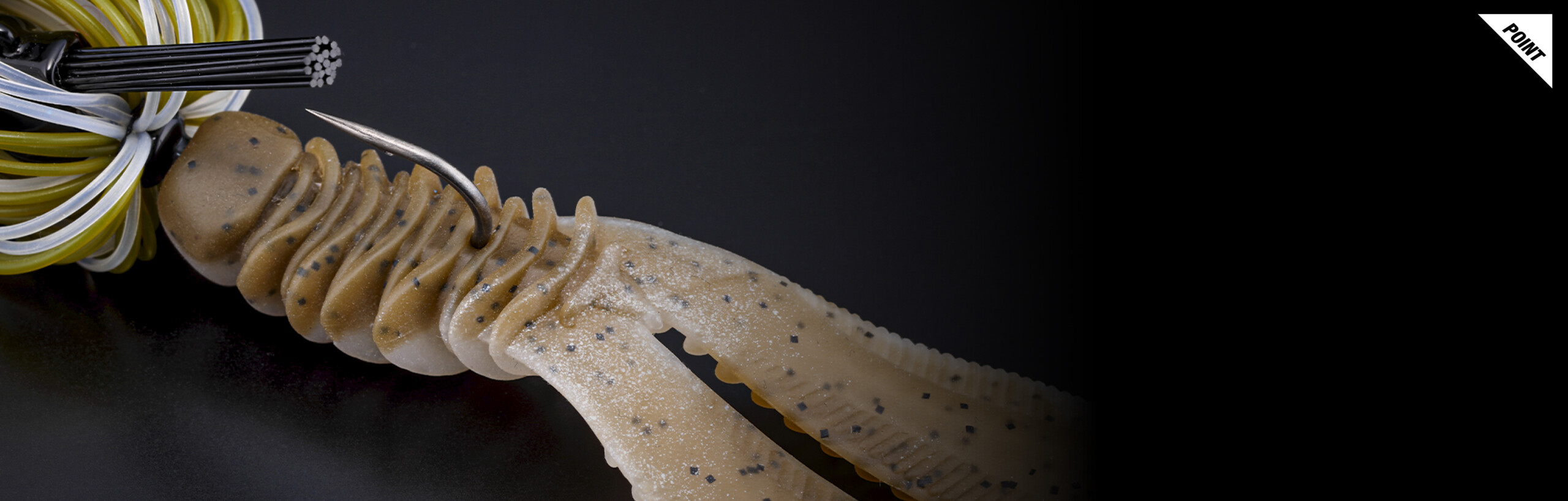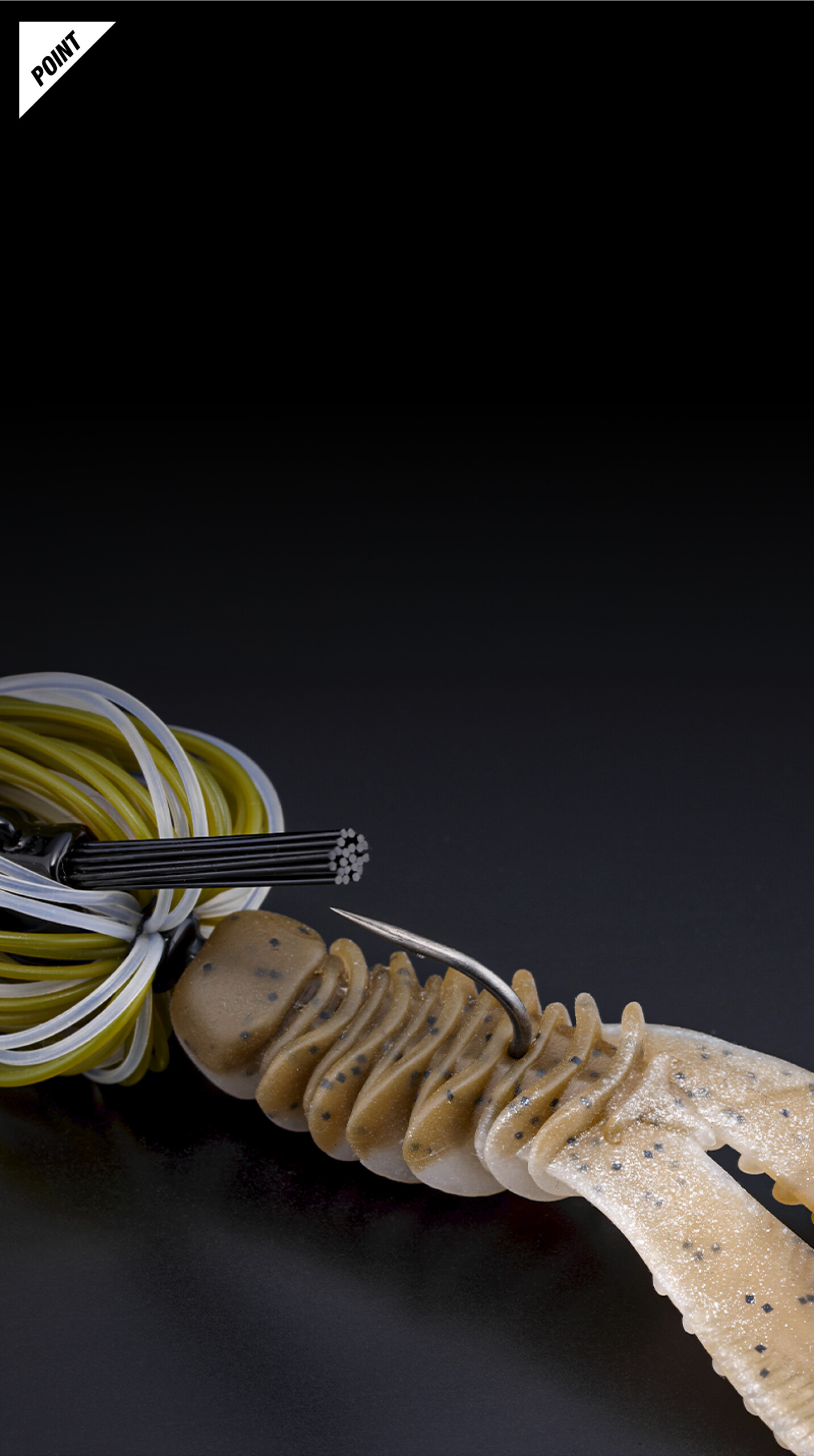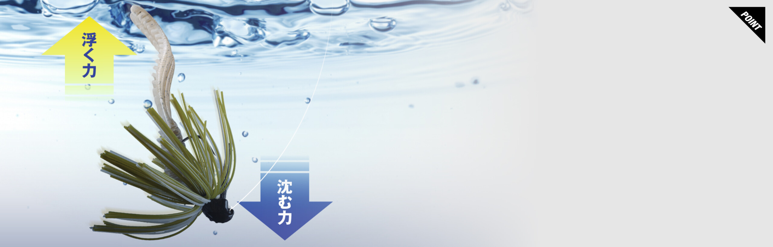 ラバージグのヘッドが沈む力と相反するエラストマー素材の浮く力が働くことで、ジグストのアクションを加えた際に移動距離を極限まで短く抑えたスイミングアクションが演出可能です。