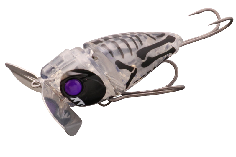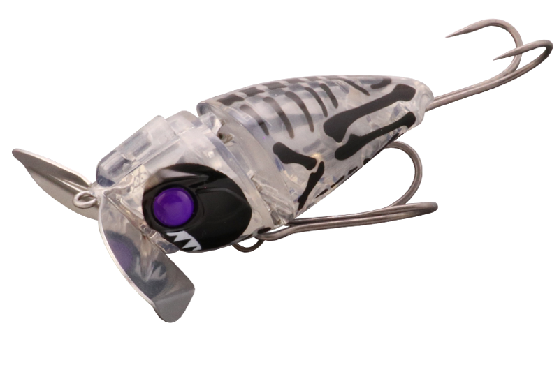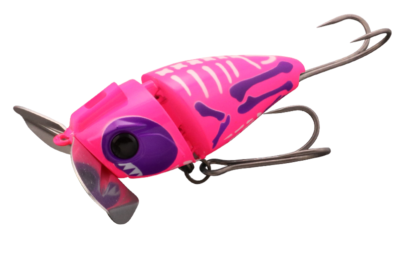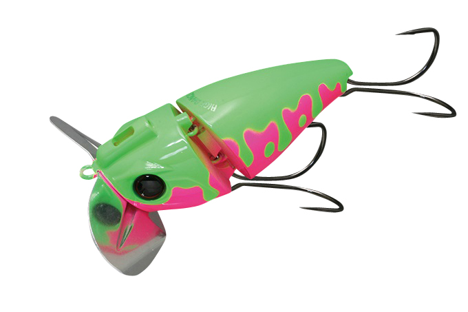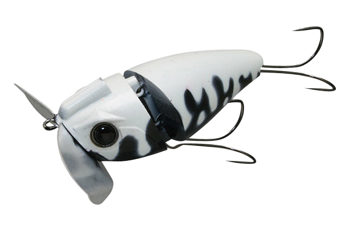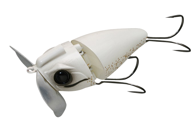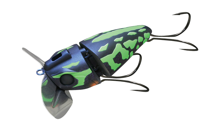 バグカップ搭載のノイジープラグにジョイント構造を採用。ジョイントで繋がれた2つのボディが干渉し、「カコカコ」と独特のサウンドでナマズを誘います。また、バグカップとの相乗効果で、ジョイント部がしっかりと水を噛み、スローリトリーブからファーストリトリーブまで幅広いスピードに対応。止水域から急流域、アップストリームからダウンストリームまであらゆる状況でストレスのない使用感を実現。更に鯰ゲームの課題とも言える「フッキングの悪さ」を徹底研究。ボディ形状、フック位置など細部にこだわり、抜群のフッキング率を誇るアイテムとなりました。