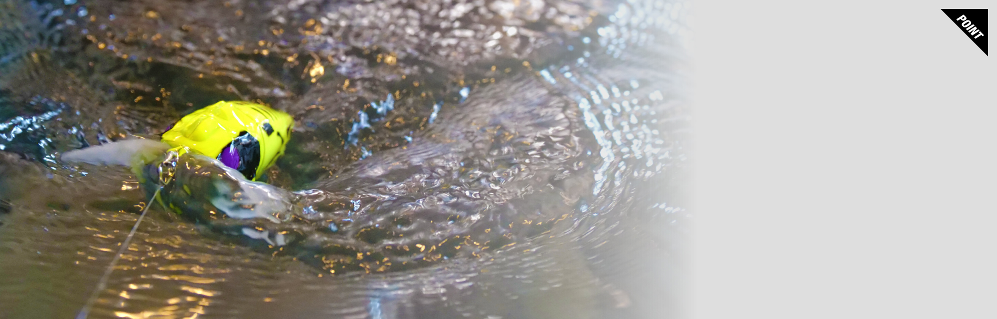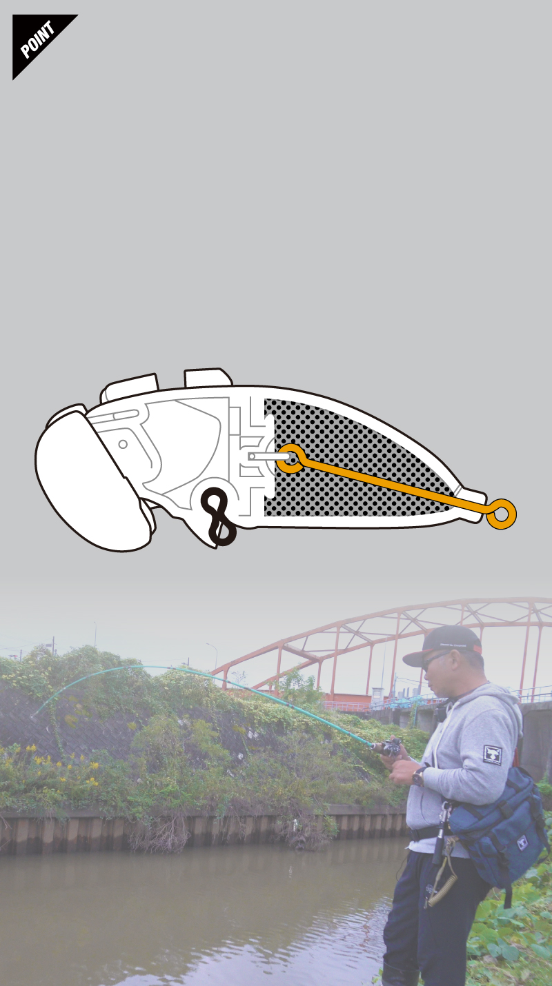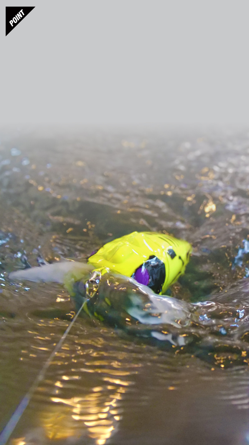 ハイブリッド構造ボディから発生するやわらかな波動が、プレッシャーを与え難い甘いサウンドを奏でながらナマズを魅了します。