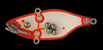 最大の特徴は口部にセットされた高比重タングステン素材を使用した成形ウエイトを搭載したO.M.S(アウトメタルシステム)。ボディの外にウエイトを設計し低重心化することでキャスト時の飛行姿勢とあらゆる速度に対応するアクションの安定化するだけでなく、ボトムで倒れ込まない姿勢により根掛かり回避性能に優れています。
