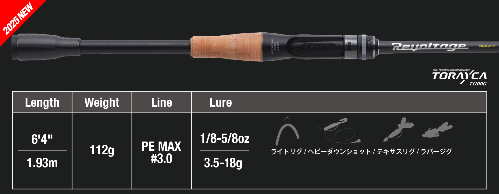 | 【2025 NEW】RVⅡ-C64M+PBF | 6'4"(1.93m) | 2pcs (仕舞寸法167cm) | 112g | MEDIUM PLUS PE BAIT FINESSE | ー | 3.5-18g | PE MAX #3.0 | ¥36,289 |