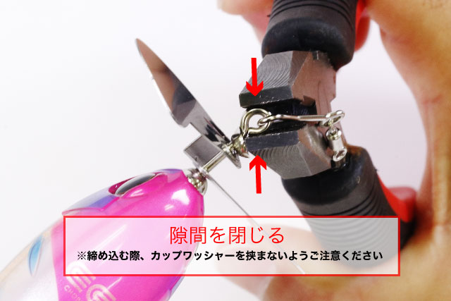 解決策としては、カップワッシャーが挟まってしまうヒートンの隙間をペンチ等で閉じて頂ますようお願い申し上げます。