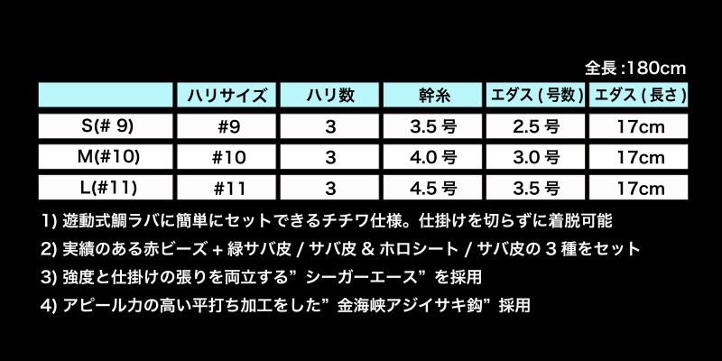 フラッグトラップSLJサビキは、ロッド操作によってアクションをつけるSLJと合わせて使用することを想定し、取り回しがよくトラブルを減らすためのショート尺で設計。方や、一定速度で巻き続ける事がメインとなる鯛ラバジギングのビンビンアジサビキは、急激なラインのたるみが発生しにくくトラブルも少ないので長めの尺で設計されています。