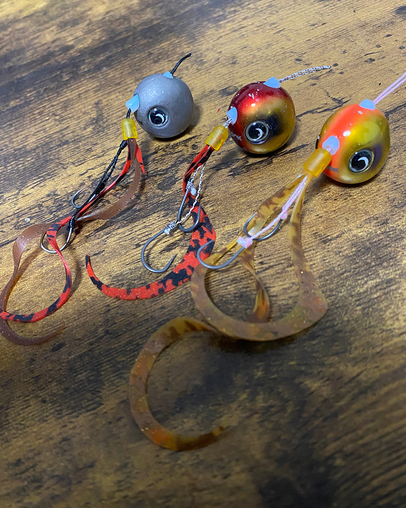 反応が中層まである場合は、「マイクロカーリースリム」の二枚付けや「フィネスカーリー」からスタートし、船全体でも竿が曲がる高活性状態であれば「デュアルカーリー」に変更。