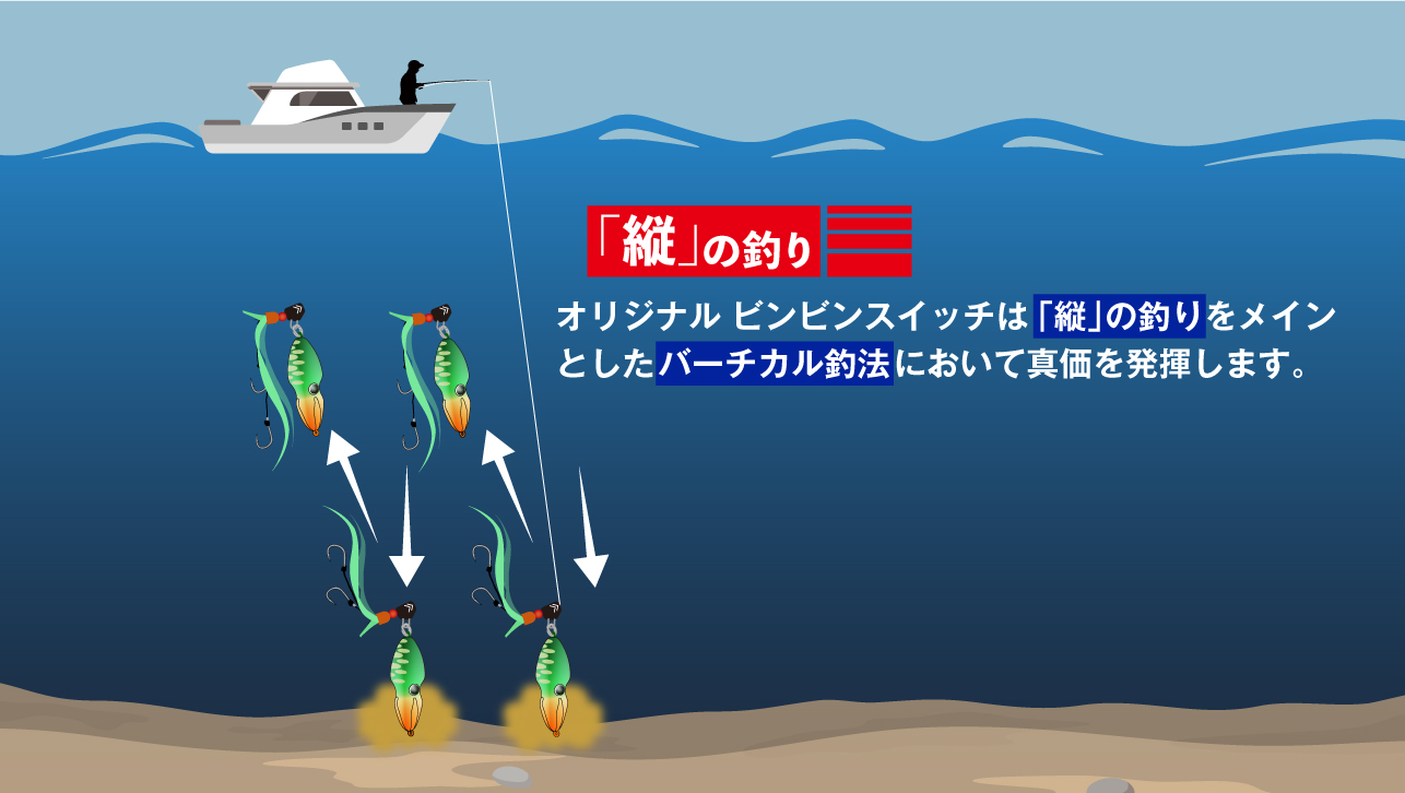 対照的に潮が緩んだ状況時は、「縦の釣り」に特化したオリジナルの「ビンビンスイッチ」を使用しています。