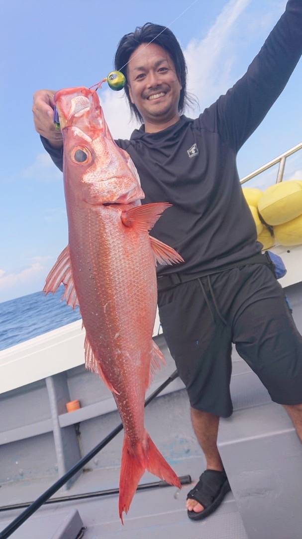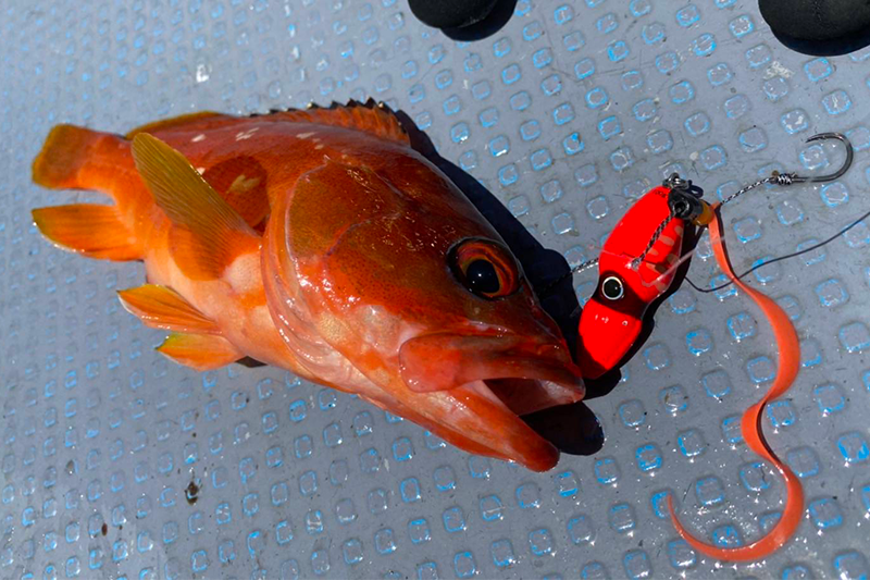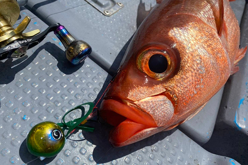 ヘッドのウエイトを60gから120gにチェンジし、バーチカルにアプローチを変更してみると、これが功を奏しアタリが出始めました。当初はフッキングまで持って行けませんでしたが、引き続きバーチカルで攻めていると、アカハタが釣れ、更に良型のイサキが釣れました!