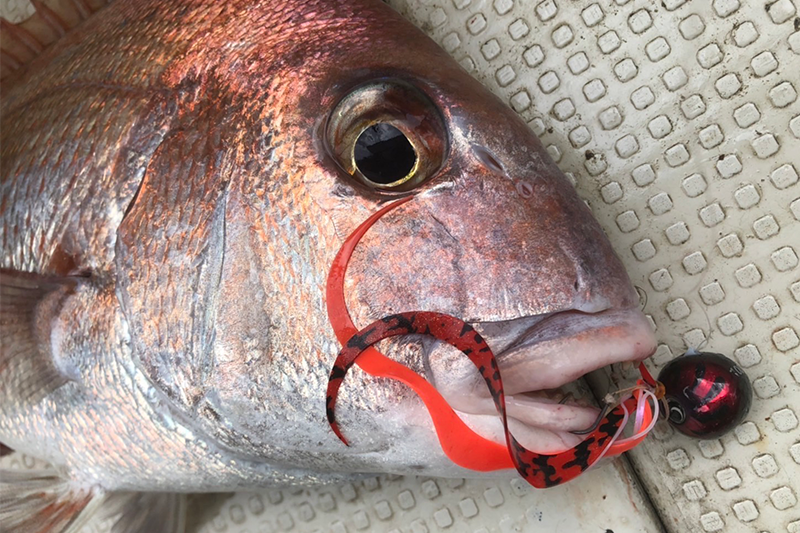 ブライトオレンジの蛍光色でアピールしながら、シマシマレッドの黒色と赤色の明滅。更にはスカートのケイムラでも真鯛を誘います。