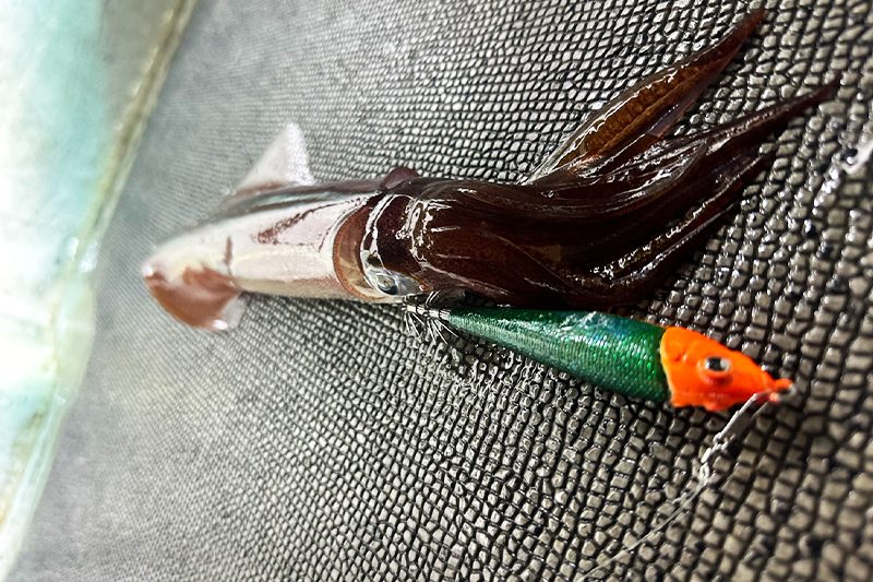 明るいうちはボトム中心という案内があったのでボトム付近を狙っているとファーストヒット!量型のケンサキイカが上がってきました。
