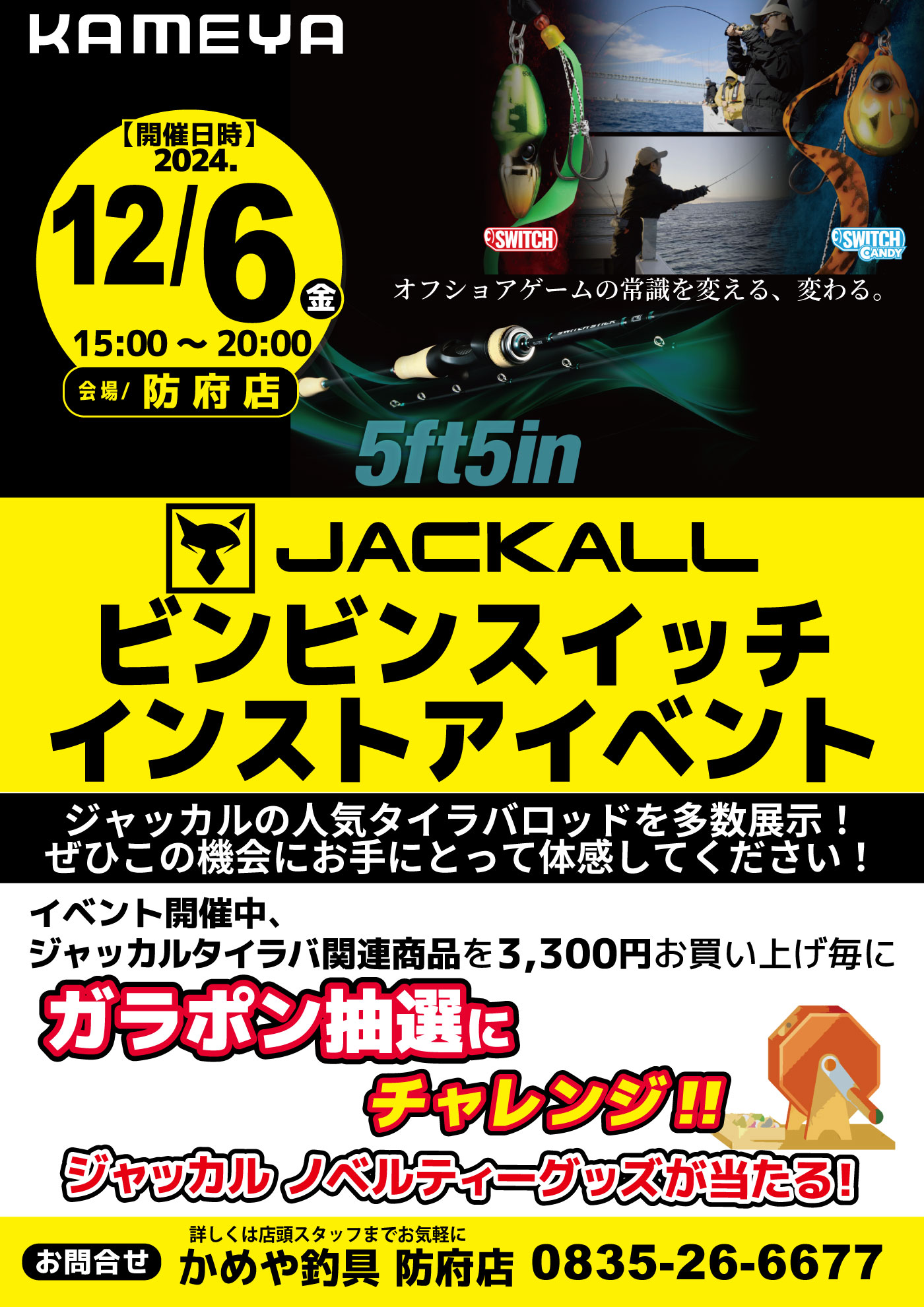 12月6日(土)15:00〜20:00、かめや釣具防府店様にて「JACKALL ビンビンスイッチインストアイベント」を開催いたします。