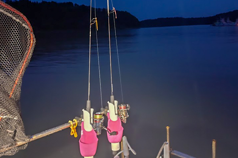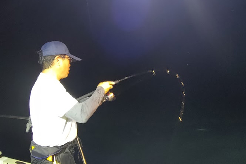 20分ほどで水深20mほどのポイントに到着。辺りはすでに薄暗く、すぐに集魚灯をつけます。