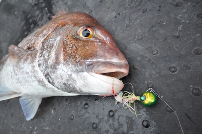 フォールでじっくりと鯛にカブラを見せ集めた後に、弱い水押しでナチュラルに誘う。