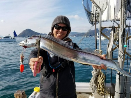 何と、タチウオテンヤ初挑戦にして、見事F7ドラゴンをキャッチ!