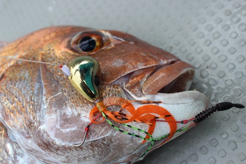 チョン掛けで真鯛のバイトを誘発する鯛ペケと鯛コーム。